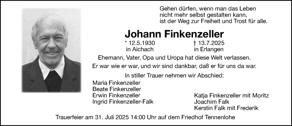 Hier finden Sie alle Traueranzeigen aus der Zeitung, die bisher für Johann Finkenzeller erschienen sind. Weitere Traueranzeigen, die in der Zeitung erscheinen, werden hier ebenfalls aufgelistet