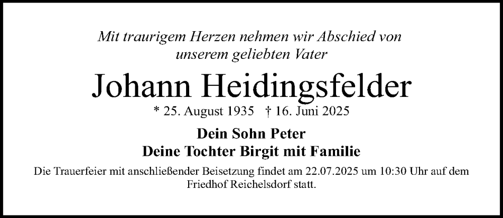 Hier finden Sie alle Traueranzeigen aus der Zeitung, die bisher für Johann Heidingsfelder erschienen sind. Weitere Traueranzeigen, die in der Zeitung erscheinen, werden hier ebenfalls aufgelistet