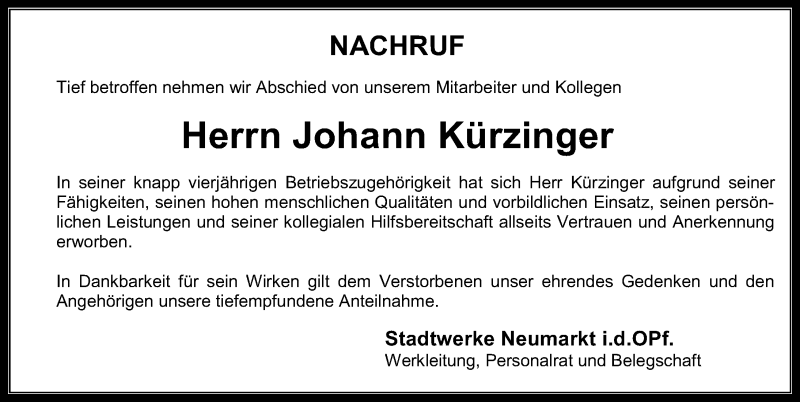 Hier finden Sie alle Traueranzeigen aus der Zeitung, die bisher für Johann Kürzinger erschienen sind. Weitere Traueranzeigen, die in der Zeitung erscheinen, werden hier ebenfalls aufgelistet
