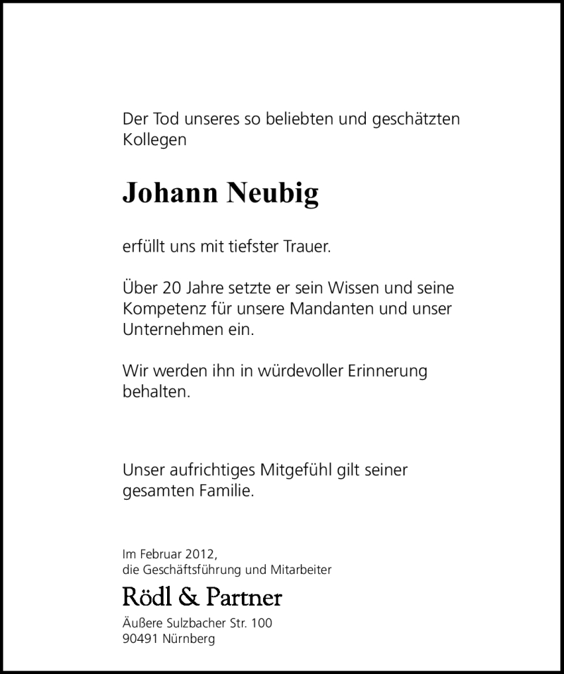 Hier finden Sie alle Traueranzeigen aus der Zeitung, die bisher für Johann Neubig erschienen sind. Weitere Traueranzeigen, die in der Zeitung erscheinen, werden hier ebenfalls aufgelistet
