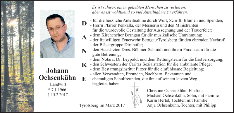 Hier finden Sie alle Traueranzeigen aus der Zeitung, die bisher für Johann Ochsenkühn erschienen sind. Weitere Traueranzeigen, die in der Zeitung erscheinen, werden hier ebenfalls aufgelistet