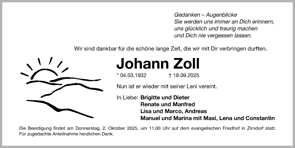 Hier finden Sie alle Traueranzeigen aus der Zeitung, die bisher für Johann Zoll erschienen sind. Weitere Traueranzeigen, die in der Zeitung erscheinen, werden hier ebenfalls aufgelistet