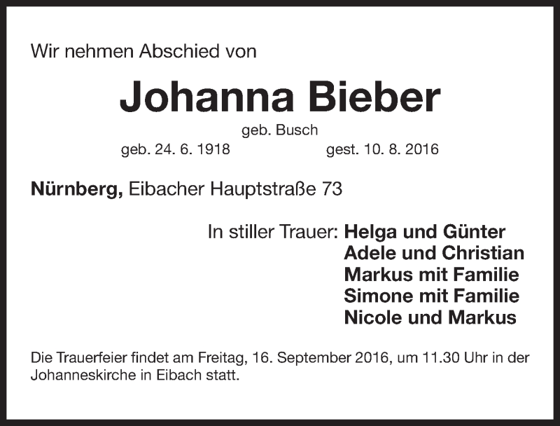 Hier finden Sie alle Traueranzeigen aus der Zeitung, die bisher für Johanna Bieber erschienen sind. Weitere Traueranzeigen, die in der Zeitung erscheinen, werden hier ebenfalls aufgelistet