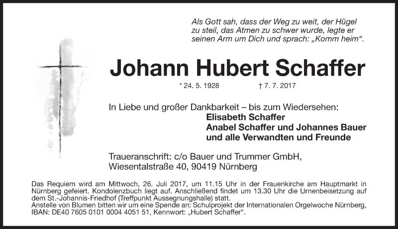 Hier finden Sie alle Traueranzeigen aus der Zeitung, die bisher für Johann Hubert Schaffer erschienen sind. Weitere Traueranzeigen, die in der Zeitung erscheinen, werden hier ebenfalls aufgelistet