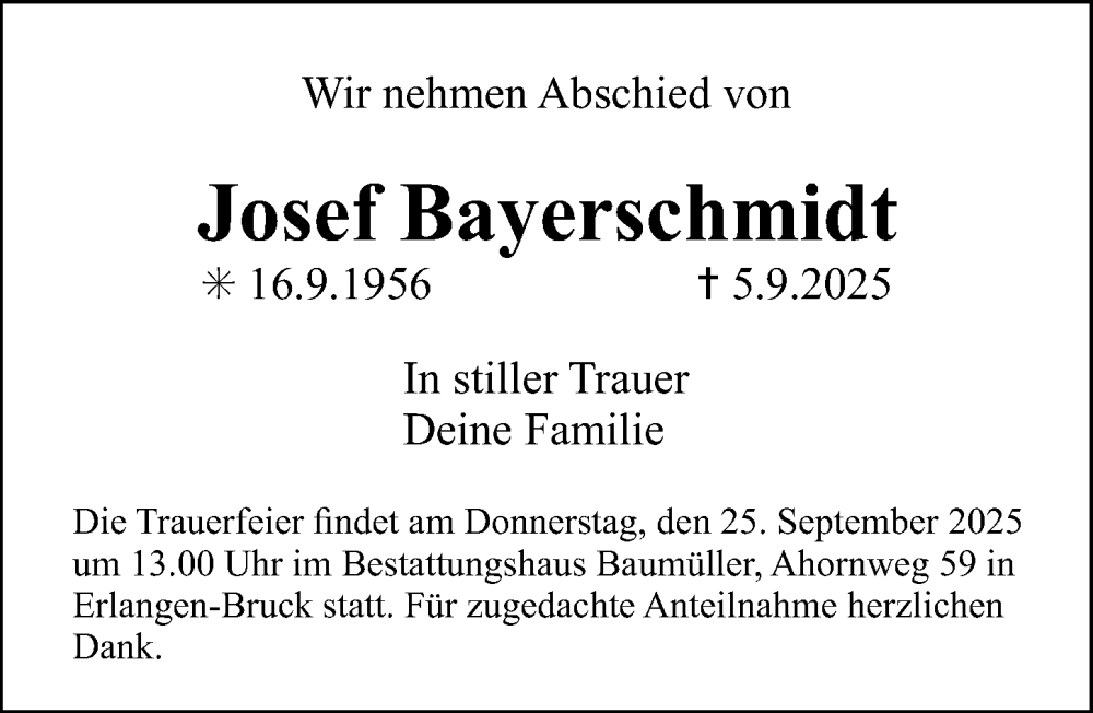 Hier finden Sie alle Traueranzeigen aus der Zeitung, die bisher für Josef Bayerschmidt erschienen sind. Weitere Traueranzeigen, die in der Zeitung erscheinen, werden hier ebenfalls aufgelistet