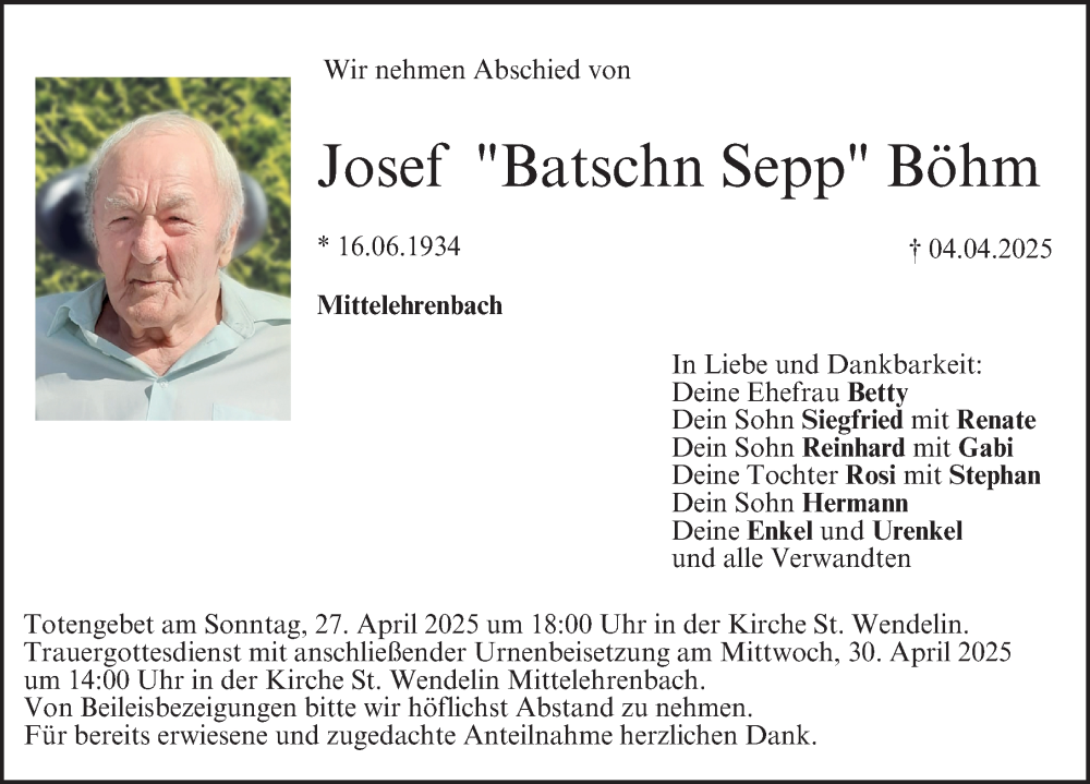 Hier finden Sie alle Traueranzeigen aus der Zeitung, die bisher für Josef Böhm erschienen sind. Weitere Traueranzeigen, die in der Zeitung erscheinen, werden hier ebenfalls aufgelistet