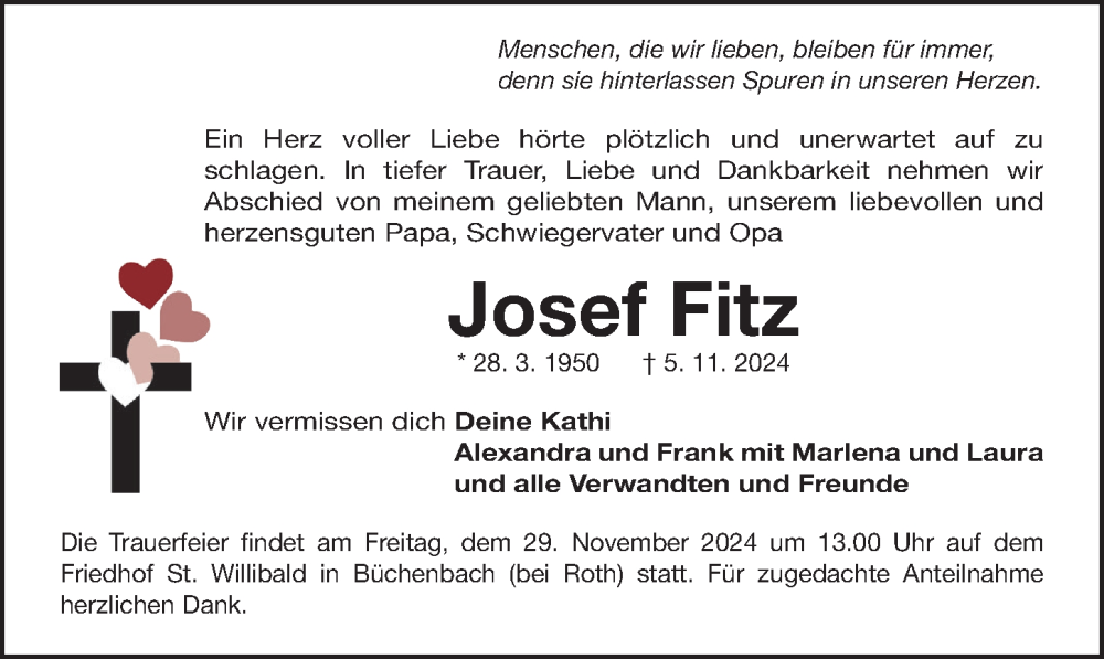 Hier finden Sie alle Traueranzeigen aus der Zeitung, die bisher für Josef Fitz erschienen sind. Weitere Traueranzeigen, die in der Zeitung erscheinen, werden hier ebenfalls aufgelistet