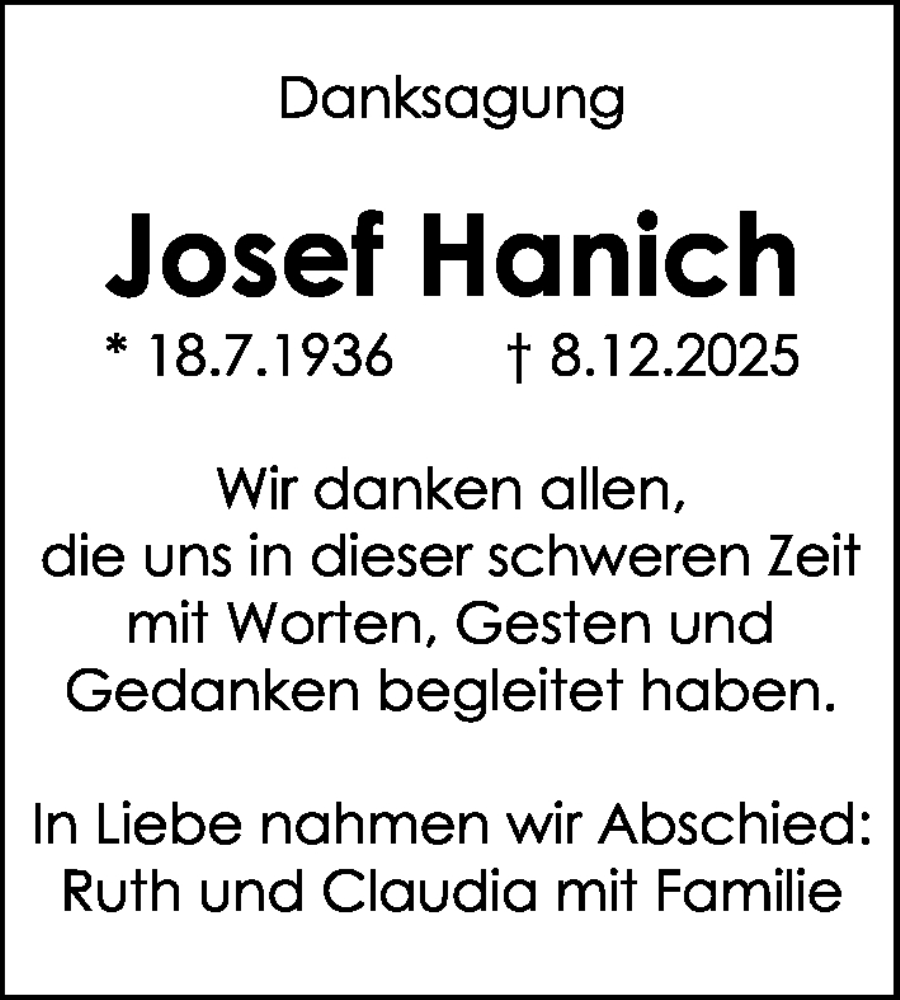 Hier finden Sie alle Traueranzeigen aus der Zeitung, die bisher für Josef Hanich erschienen sind. Weitere Traueranzeigen, die in der Zeitung erscheinen, werden hier ebenfalls aufgelistet