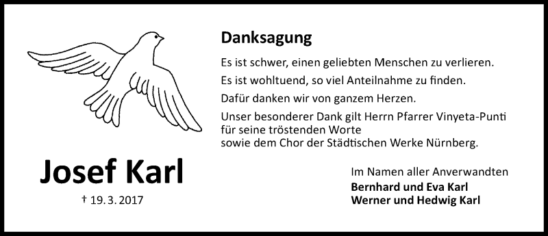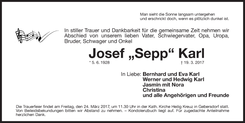 Hier finden Sie alle Traueranzeigen aus der Zeitung, die bisher für Josef Karl erschienen sind. Weitere Traueranzeigen, die in der Zeitung erscheinen, werden hier ebenfalls aufgelistet