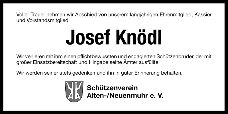 Hier finden Sie alle Traueranzeigen aus der Zeitung, die bisher für Josef Knödl erschienen sind. Weitere Traueranzeigen, die in der Zeitung erscheinen, werden hier ebenfalls aufgelistet