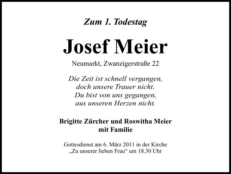 Hier finden Sie alle Traueranzeigen aus der Zeitung, die bisher für Josef Meier erschienen sind. Weitere Traueranzeigen, die in der Zeitung erscheinen, werden hier ebenfalls aufgelistet