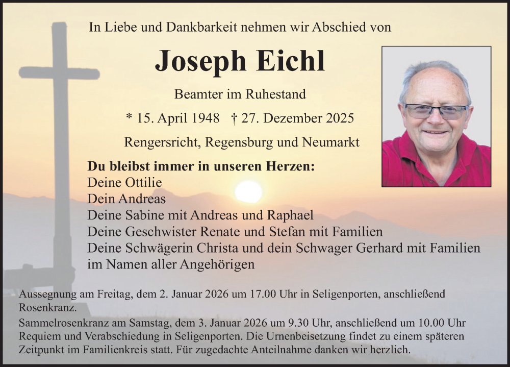 Hier finden Sie alle Traueranzeigen aus der Zeitung, die bisher für Joseph Eichl erschienen sind. Weitere Traueranzeigen, die in der Zeitung erscheinen, werden hier ebenfalls aufgelistet