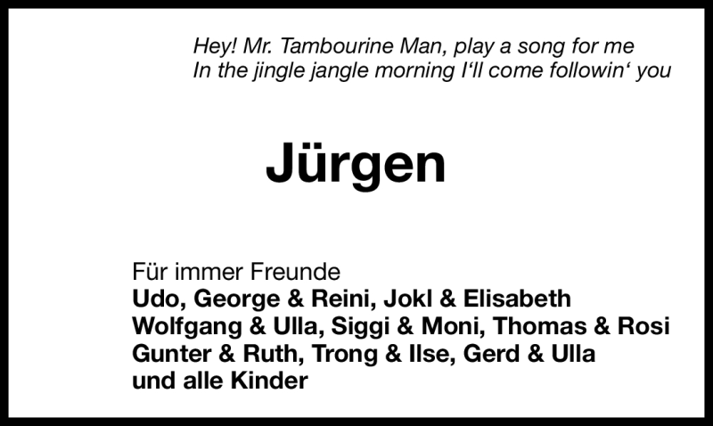 Hier finden Sie alle Traueranzeigen aus der Zeitung, die bisher für Jürgen erschienen sind. Weitere Traueranzeigen, die in der Zeitung erscheinen, werden hier ebenfalls aufgelistet