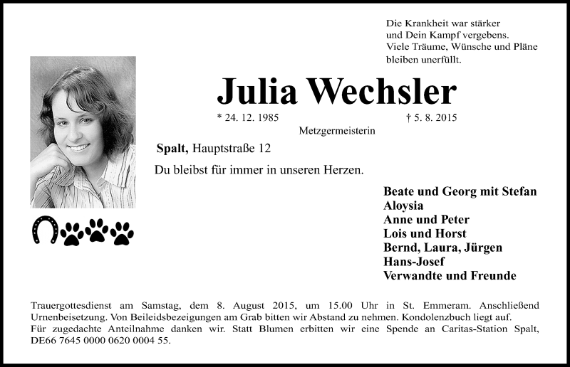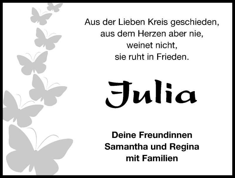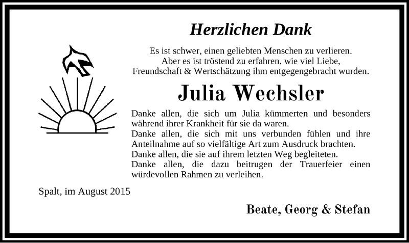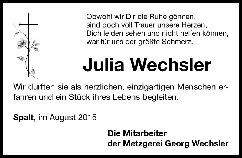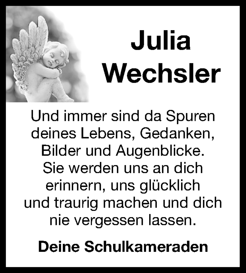 Hier finden Sie alle Traueranzeigen aus der Zeitung, die bisher für Julia Wechsler erschienen sind. Weitere Traueranzeigen, die in der Zeitung erscheinen, werden hier ebenfalls aufgelistet