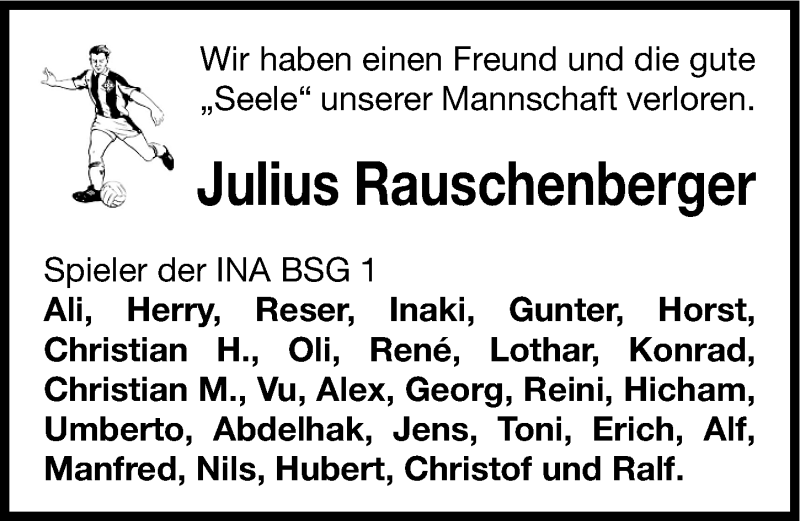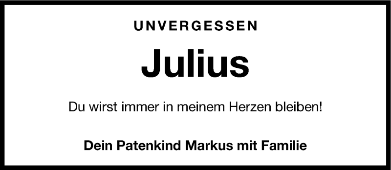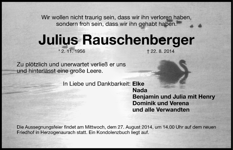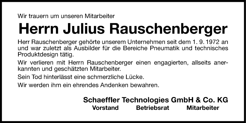 Hier finden Sie alle Traueranzeigen aus der Zeitung, die bisher für Julius Rauschenberger erschienen sind. Weitere Traueranzeigen, die in der Zeitung erscheinen, werden hier ebenfalls aufgelistet