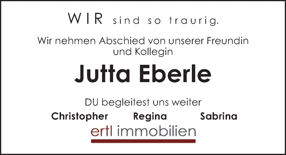 Hier finden Sie alle Traueranzeigen aus der Zeitung, die bisher für Jutta Eberle erschienen sind. Weitere Traueranzeigen, die in der Zeitung erscheinen, werden hier ebenfalls aufgelistet