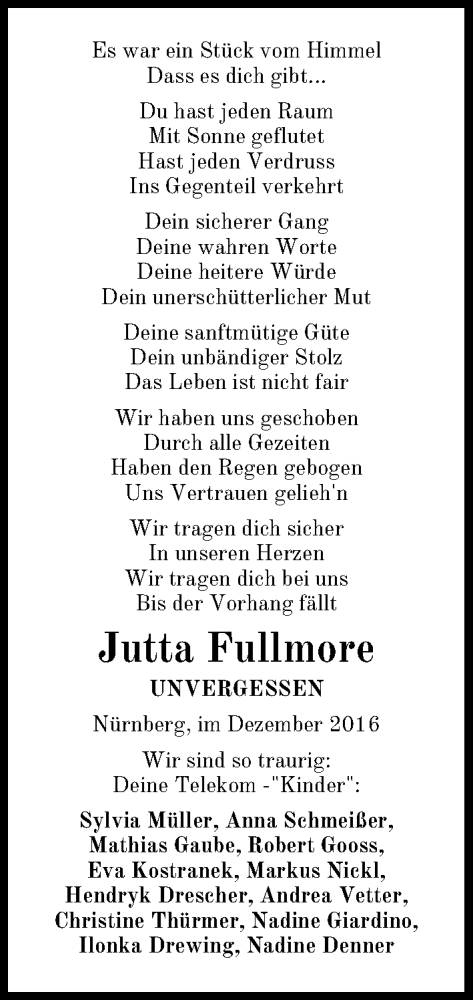 Hier finden Sie alle Traueranzeigen aus der Zeitung, die bisher für Jutta Fullmore erschienen sind. Weitere Traueranzeigen, die in der Zeitung erscheinen, werden hier ebenfalls aufgelistet