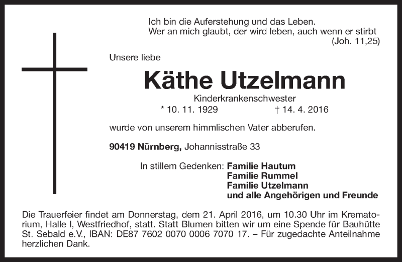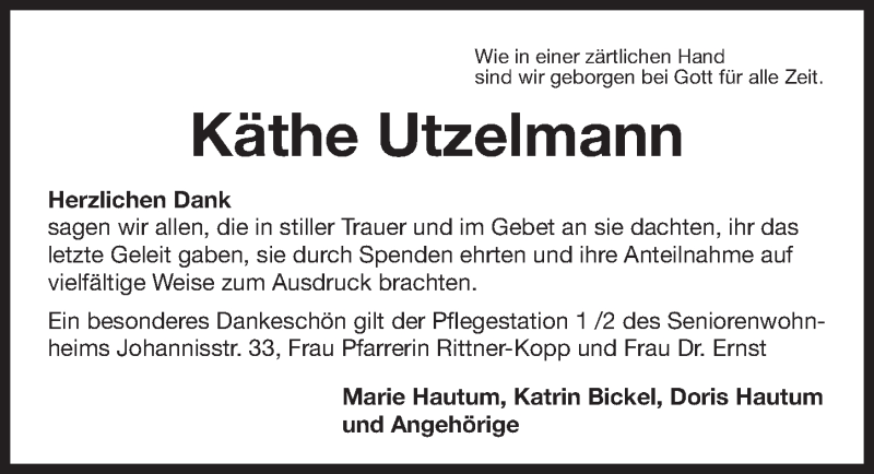Hier finden Sie alle Traueranzeigen aus der Zeitung, die bisher für Käthe Utzelmann erschienen sind. Weitere Traueranzeigen, die in der Zeitung erscheinen, werden hier ebenfalls aufgelistet