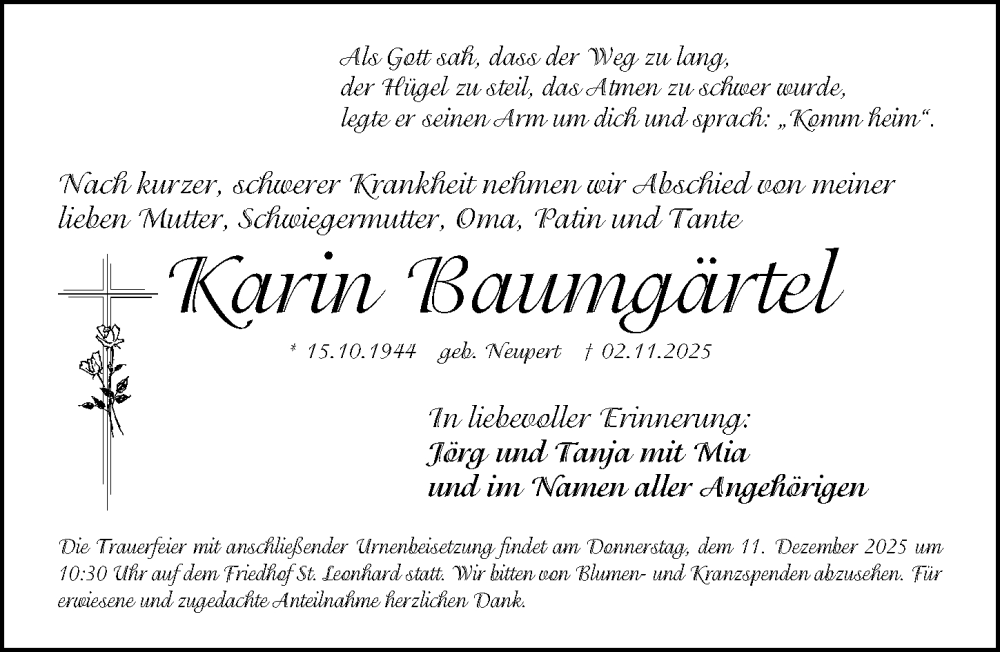 Hier finden Sie alle Traueranzeigen aus der Zeitung, die bisher für Karin Baumgärtel erschienen sind. Weitere Traueranzeigen, die in der Zeitung erscheinen, werden hier ebenfalls aufgelistet