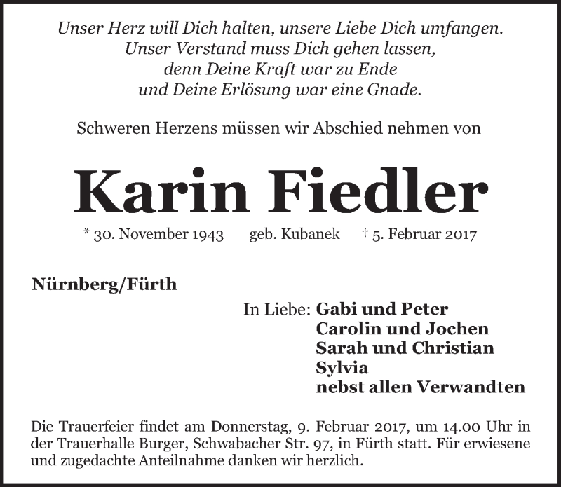 Hier finden Sie alle Traueranzeigen aus der Zeitung, die bisher für Karin Fiedler erschienen sind. Weitere Traueranzeigen, die in der Zeitung erscheinen, werden hier ebenfalls aufgelistet