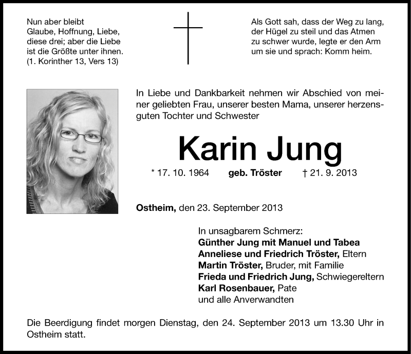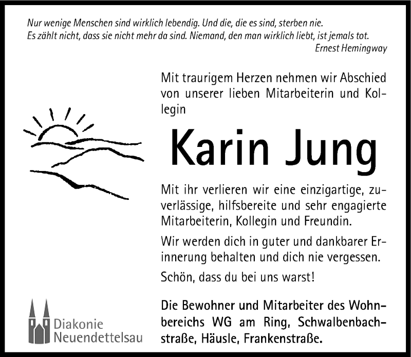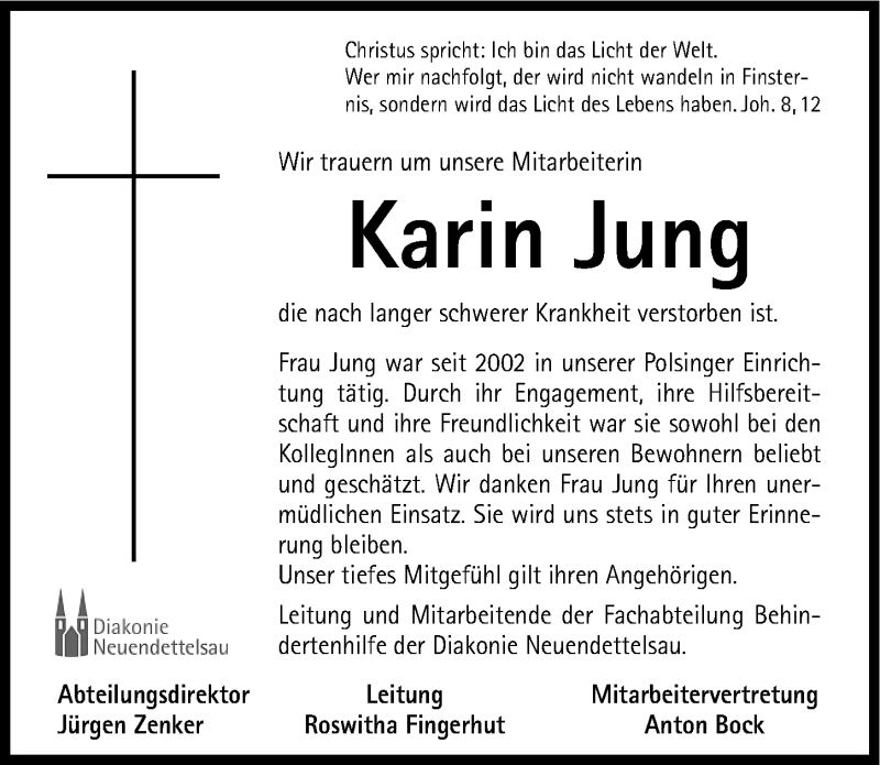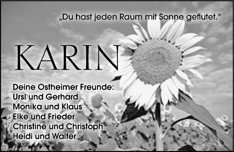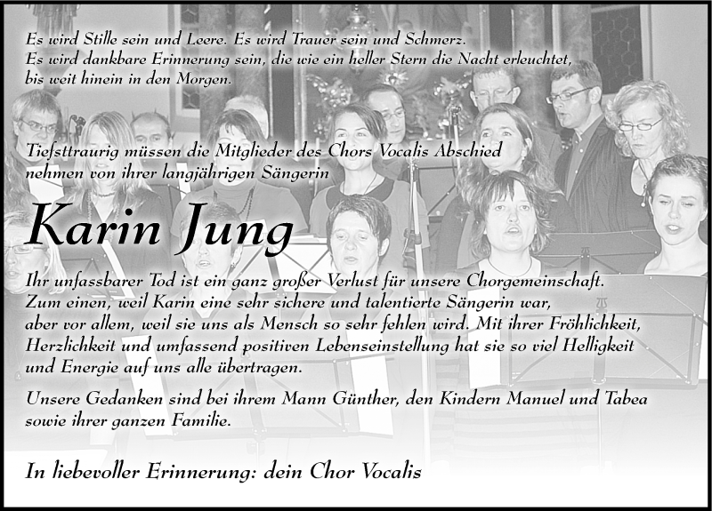 Hier finden Sie alle Traueranzeigen aus der Zeitung, die bisher für Karin Jung erschienen sind. Weitere Traueranzeigen, die in der Zeitung erscheinen, werden hier ebenfalls aufgelistet