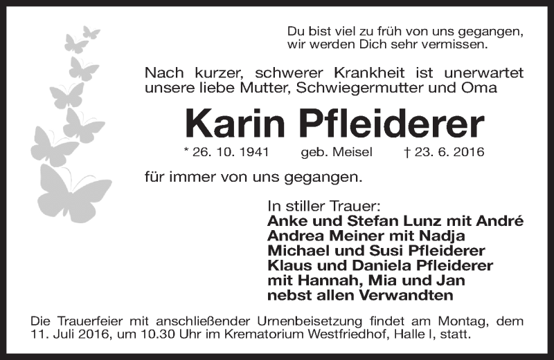 Hier finden Sie alle Traueranzeigen aus der Zeitung, die bisher für Karin Pfleiderer erschienen sind. Weitere Traueranzeigen, die in der Zeitung erscheinen, werden hier ebenfalls aufgelistet