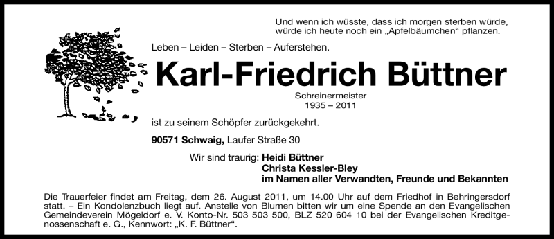 Hier finden Sie alle Traueranzeigen aus der Zeitung, die bisher für Karl-Friedrich Büttner erschienen sind. Weitere Traueranzeigen, die in der Zeitung erscheinen, werden hier ebenfalls aufgelistet