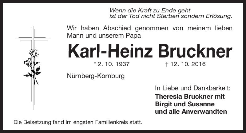 Hier finden Sie alle Traueranzeigen aus der Zeitung, die bisher für Karl-Heinz Bruckner erschienen sind. Weitere Traueranzeigen, die in der Zeitung erscheinen, werden hier ebenfalls aufgelistet