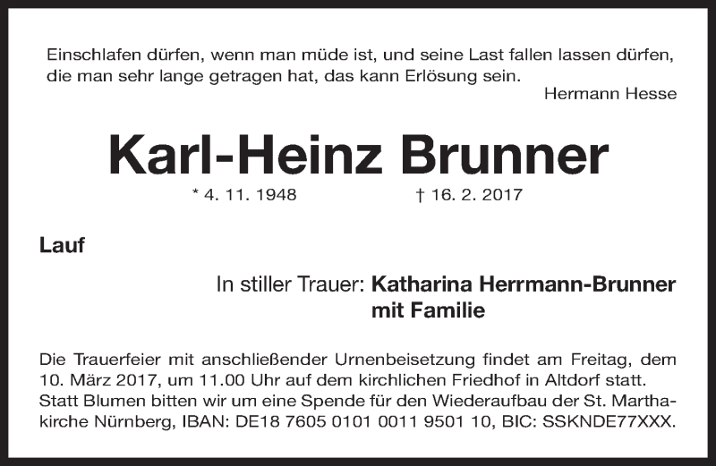 Hier finden Sie alle Traueranzeigen aus der Zeitung, die bisher für Karl-Heinz Brunner erschienen sind. Weitere Traueranzeigen, die in der Zeitung erscheinen, werden hier ebenfalls aufgelistet