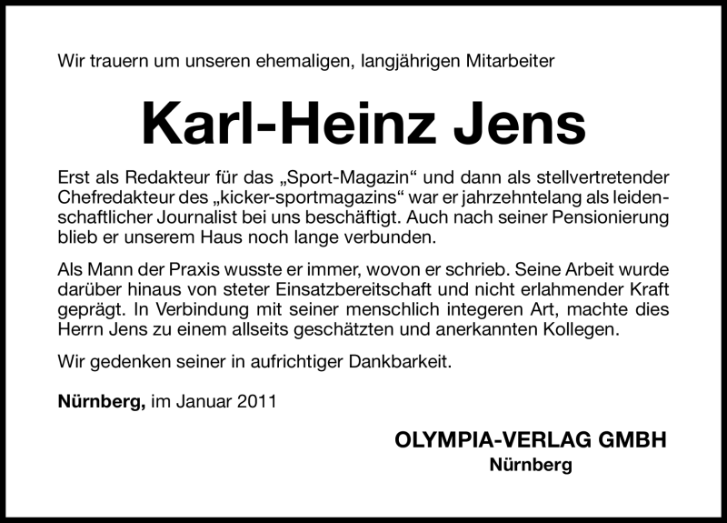Hier finden Sie alle Traueranzeigen aus der Zeitung, die bisher für Karl-Heinz Jens erschienen sind. Weitere Traueranzeigen, die in der Zeitung erscheinen, werden hier ebenfalls aufgelistet