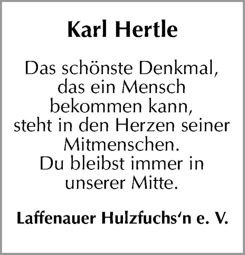 Hier finden Sie alle Traueranzeigen aus der Zeitung, die bisher für Karl Hertle erschienen sind. Weitere Traueranzeigen, die in der Zeitung erscheinen, werden hier ebenfalls aufgelistet