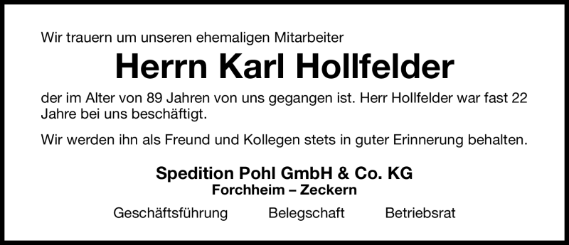 Hier finden Sie alle Traueranzeigen aus der Zeitung, die bisher für Karl Hollfelder erschienen sind. Weitere Traueranzeigen, die in der Zeitung erscheinen, werden hier ebenfalls aufgelistet