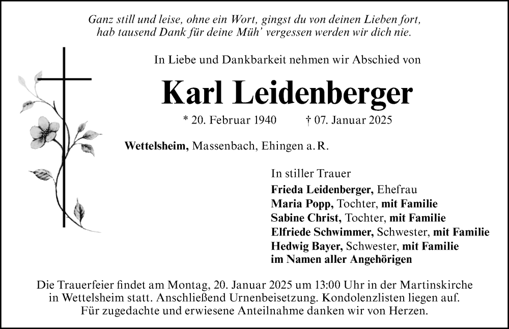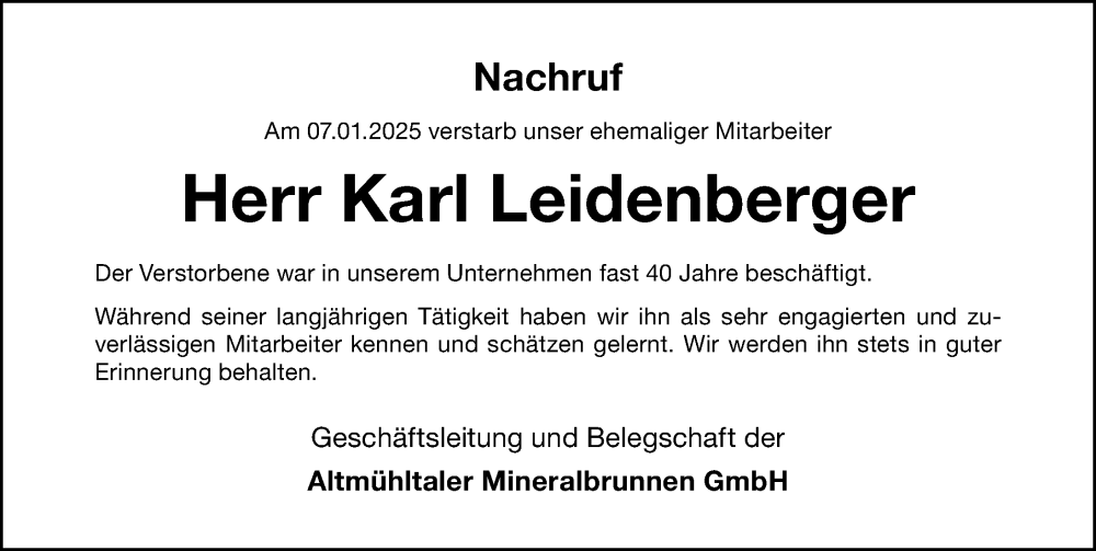 Hier finden Sie alle Traueranzeigen aus der Zeitung, die bisher für Karl Leidenberger erschienen sind. Weitere Traueranzeigen, die in der Zeitung erscheinen, werden hier ebenfalls aufgelistet