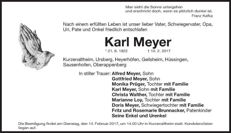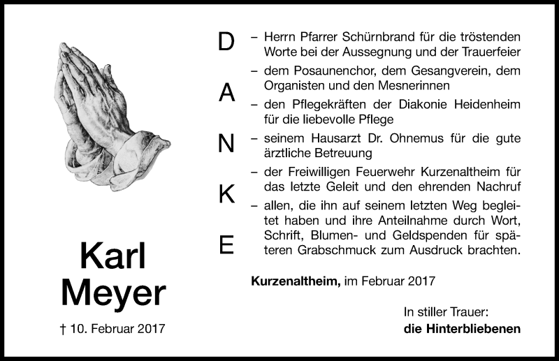 Hier finden Sie alle Traueranzeigen aus der Zeitung, die bisher für Karl Meyer erschienen sind. Weitere Traueranzeigen, die in der Zeitung erscheinen, werden hier ebenfalls aufgelistet
