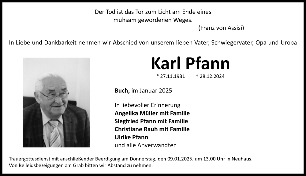 Hier finden Sie alle Traueranzeigen aus der Zeitung, die bisher für Karl Pfann erschienen sind. Weitere Traueranzeigen, die in der Zeitung erscheinen, werden hier ebenfalls aufgelistet