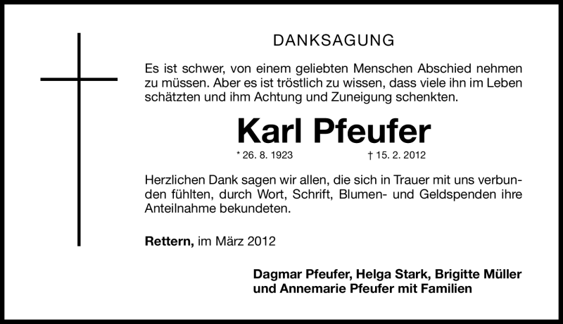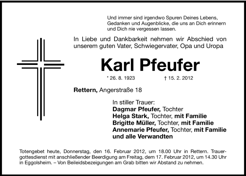 Hier finden Sie alle Traueranzeigen aus der Zeitung, die bisher für Karl Pfeufer erschienen sind. Weitere Traueranzeigen, die in der Zeitung erscheinen, werden hier ebenfalls aufgelistet