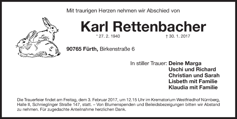 Hier finden Sie alle Traueranzeigen aus der Zeitung, die bisher für Karl Rettenbacher erschienen sind. Weitere Traueranzeigen, die in der Zeitung erscheinen, werden hier ebenfalls aufgelistet