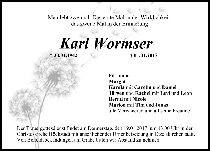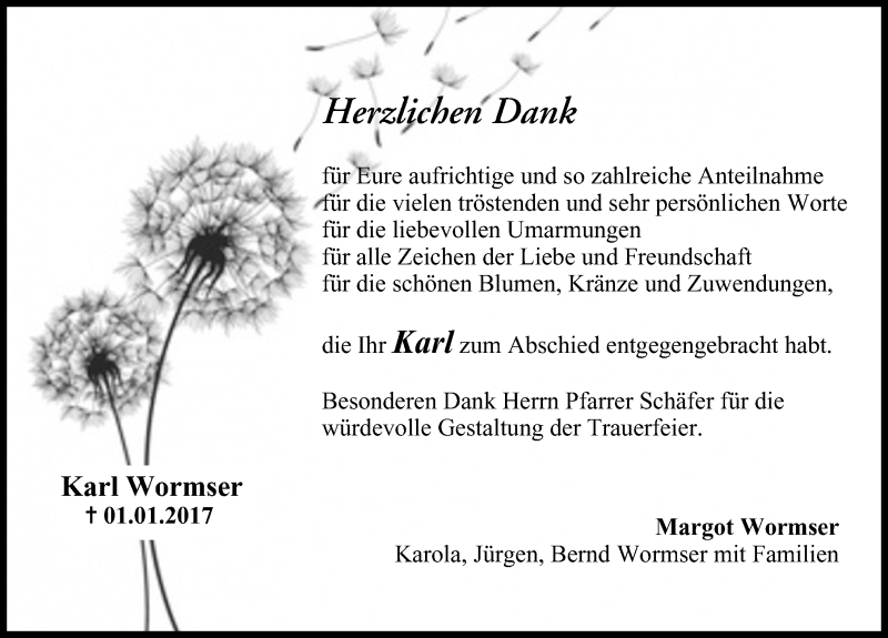 Hier finden Sie alle Traueranzeigen aus der Zeitung, die bisher für Karl Wormser erschienen sind. Weitere Traueranzeigen, die in der Zeitung erscheinen, werden hier ebenfalls aufgelistet