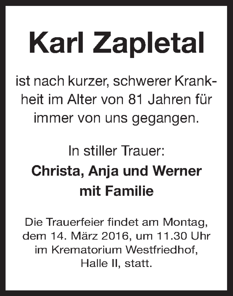 Hier finden Sie alle Traueranzeigen aus der Zeitung, die bisher für Karl Zapletal erschienen sind. Weitere Traueranzeigen, die in der Zeitung erscheinen, werden hier ebenfalls aufgelistet