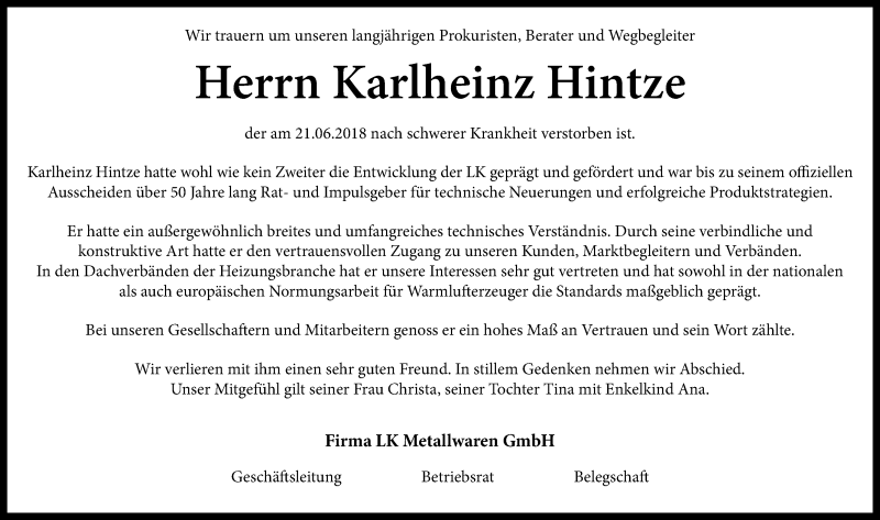 Hier finden Sie alle Traueranzeigen aus der Zeitung, die bisher für Karlheinz Hintze erschienen sind. Weitere Traueranzeigen, die in der Zeitung erscheinen, werden hier ebenfalls aufgelistet