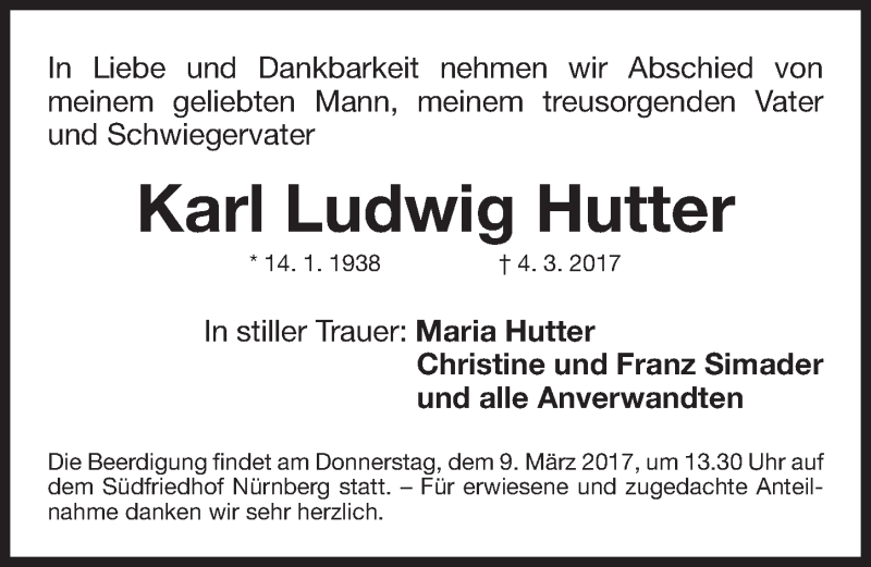 Hier finden Sie alle Traueranzeigen aus der Zeitung, die bisher für Karl Ludwig Hutter erschienen sind. Weitere Traueranzeigen, die in der Zeitung erscheinen, werden hier ebenfalls aufgelistet