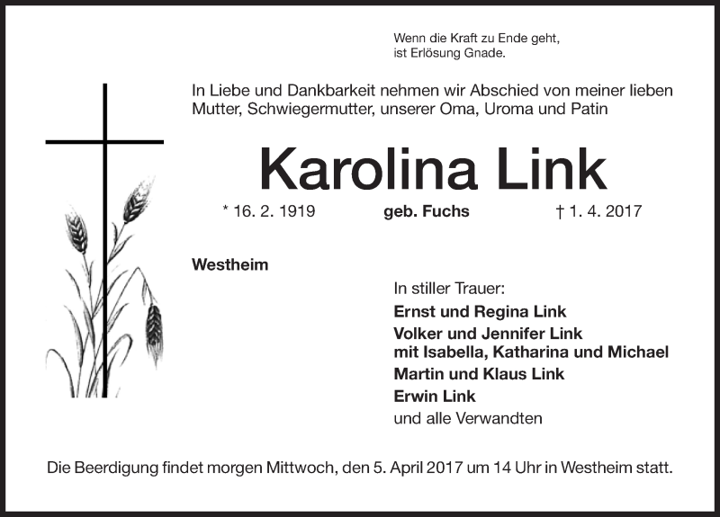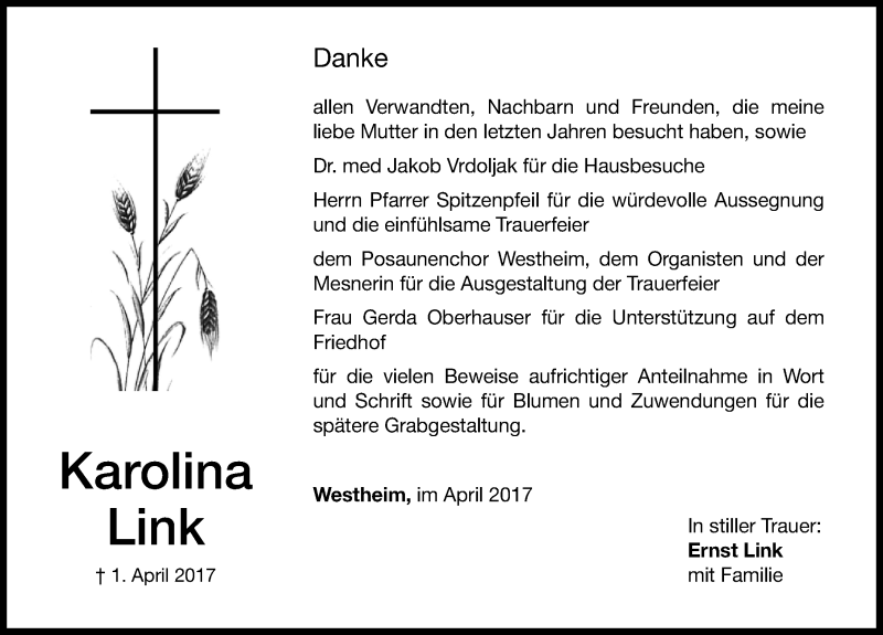Hier finden Sie alle Traueranzeigen aus der Zeitung, die bisher für Karolina Link erschienen sind. Weitere Traueranzeigen, die in der Zeitung erscheinen, werden hier ebenfalls aufgelistet