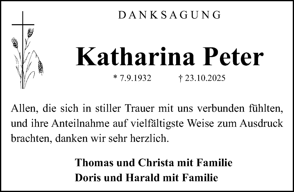 Hier finden Sie alle Traueranzeigen aus der Zeitung, die bisher für Katharina Peter erschienen sind. Weitere Traueranzeigen, die in der Zeitung erscheinen, werden hier ebenfalls aufgelistet
