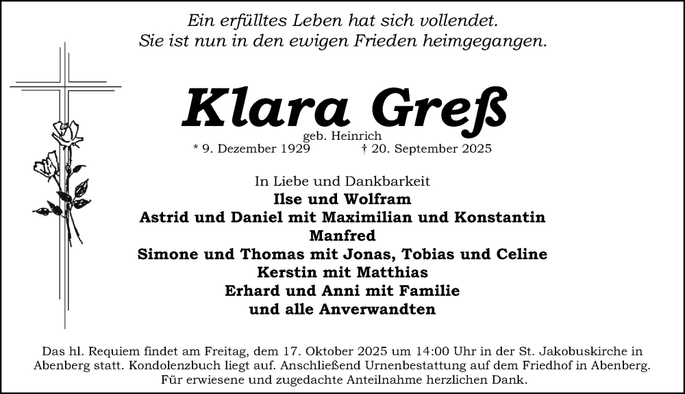 Hier finden Sie alle Traueranzeigen aus der Zeitung, die bisher für Klara Greß erschienen sind. Weitere Traueranzeigen, die in der Zeitung erscheinen, werden hier ebenfalls aufgelistet