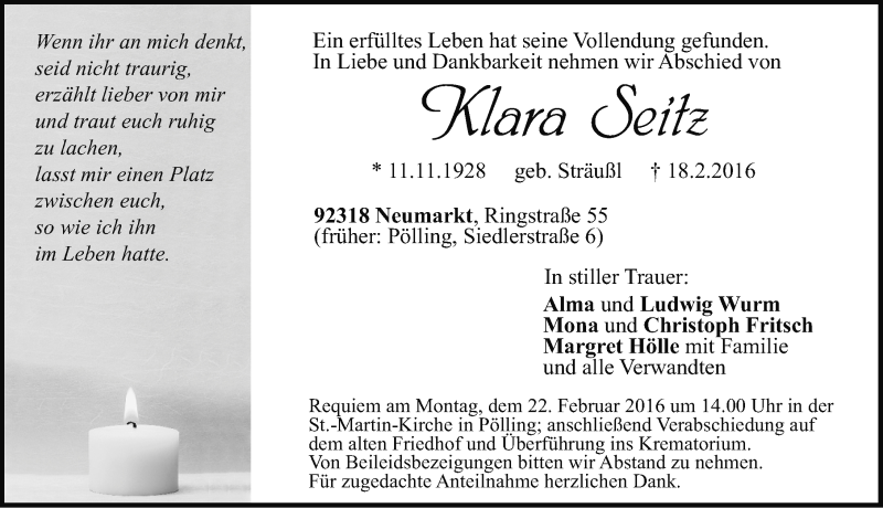 Hier finden Sie alle Traueranzeigen aus der Zeitung, die bisher für Klara Seitz erschienen sind. Weitere Traueranzeigen, die in der Zeitung erscheinen, werden hier ebenfalls aufgelistet