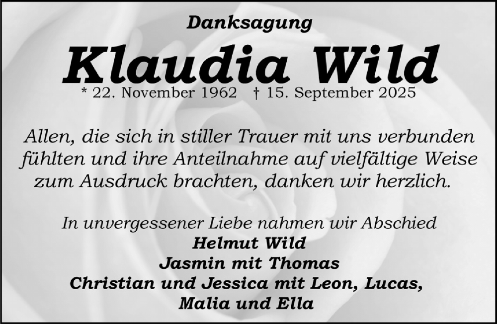 Hier finden Sie alle Traueranzeigen aus der Zeitung, die bisher für Klaudia Wild erschienen sind. Weitere Traueranzeigen, die in der Zeitung erscheinen, werden hier ebenfalls aufgelistet