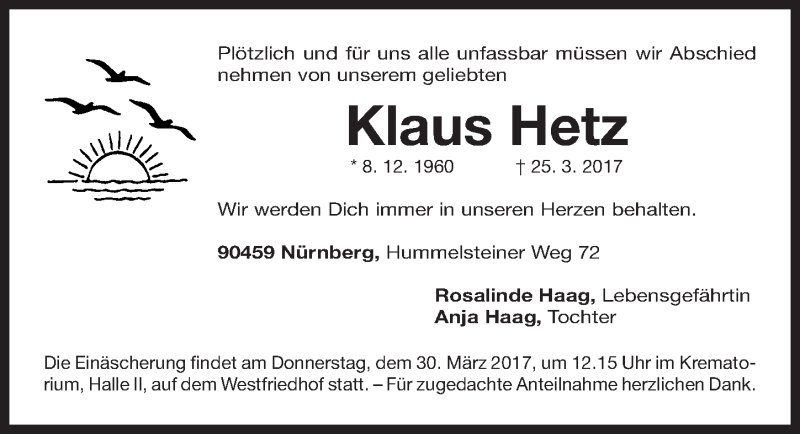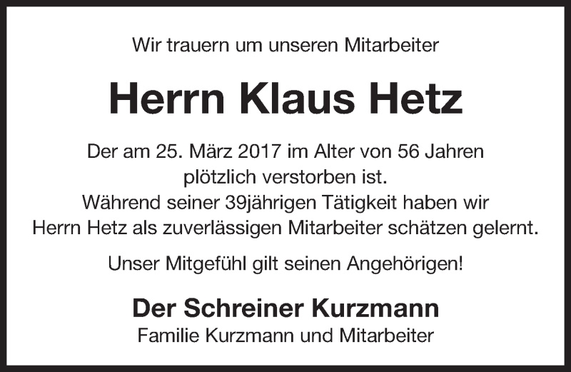 Hier finden Sie alle Traueranzeigen aus der Zeitung, die bisher für Klaus Hetz erschienen sind. Weitere Traueranzeigen, die in der Zeitung erscheinen, werden hier ebenfalls aufgelistet