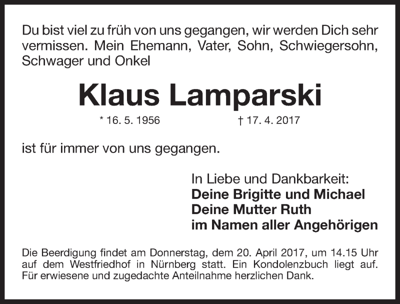 Hier finden Sie alle Traueranzeigen aus der Zeitung, die bisher für Klaus Lamparski erschienen sind. Weitere Traueranzeigen, die in der Zeitung erscheinen, werden hier ebenfalls aufgelistet