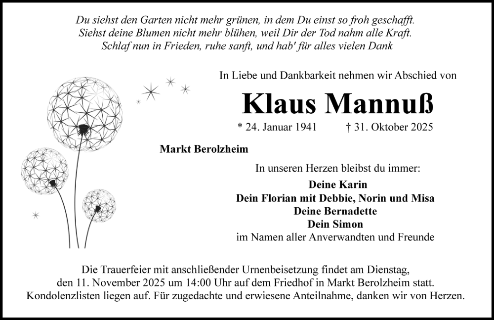 Hier finden Sie alle Traueranzeigen aus der Zeitung, die bisher für Klaus Mannfuß erschienen sind. Weitere Traueranzeigen, die in der Zeitung erscheinen, werden hier ebenfalls aufgelistet
