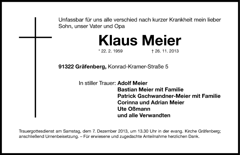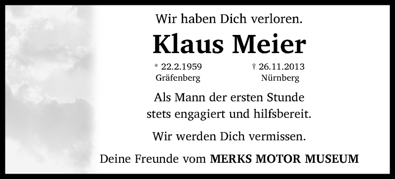 Hier finden Sie alle Traueranzeigen aus der Zeitung, die bisher für Klaus Meier erschienen sind. Weitere Traueranzeigen, die in der Zeitung erscheinen, werden hier ebenfalls aufgelistet